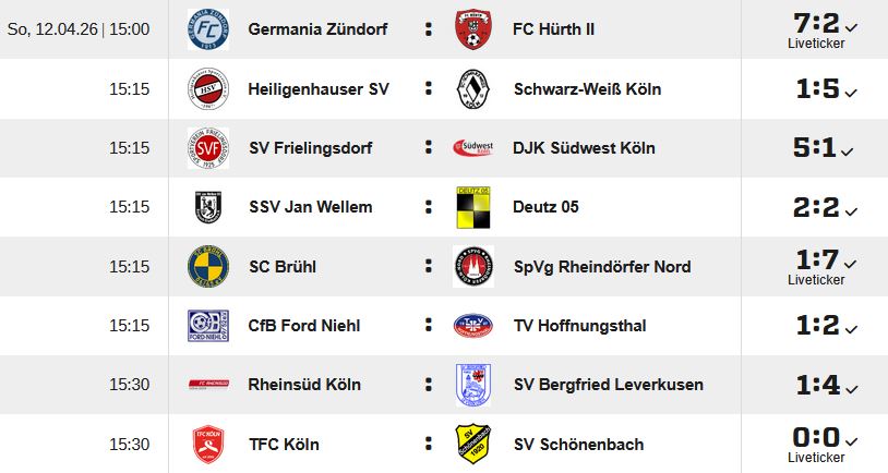In der Bezirksliga bleibt der FC Germania Zündorf trotz des Kantersieges (19 Pkt.) weiter in akuter Abstiegsgefahr, gefolgt vom TFC, der 18 Punkte aufweisen kann. Mit in den Abstiegsstrudel ist jetzt der CfB Ford Niehl geraten, die mit 22 Punkten noch drei Zähler vor den Germanen rangieren. Der ehemalige Konkurrent SW Köln (23) scheint sich langsam zu befreien.