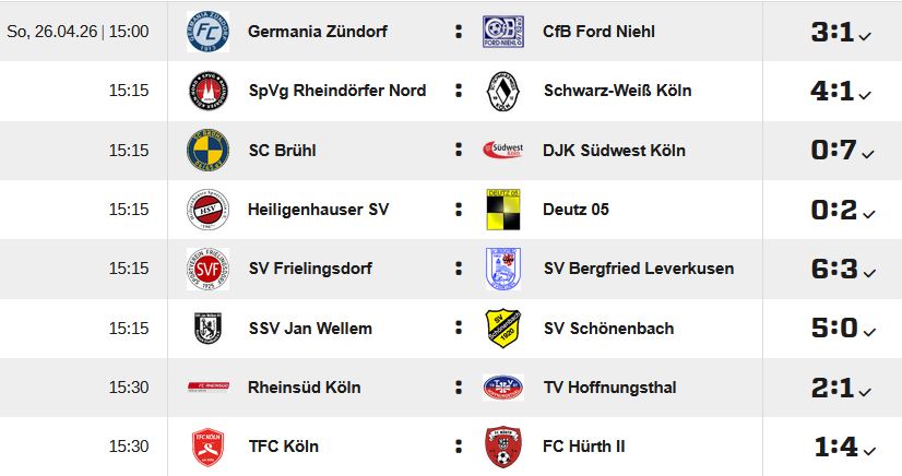 In der Bezirksliga ist dem FC Germania Zündorf endlich der Sprung auf den Rettungsplatz gelungen (23 Pkt.). Gegen den direkten Konkurrenten CfB Ford Niehl (22) blieb die Dick-Elf siegreich und darf sich damit weitere Hoffnungen auf den Klassenerhalt machen. Der Türkische FC mit 19 Pkt. hat noch leichte Tuchfühlung, während der SC Brühl bereits abgestiegen ist (3).