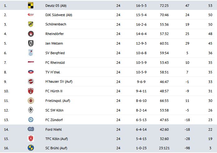 An der Tabellenspitze konnte Primus SV Deutz 05 (53) seine Stellung verteidigen. Die Verfolger DJK Südwest und der SV Schönenbach (beide 50) bleiben weiter in Lauerstellung.