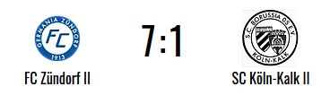 Mit einem deutlichen 7:1 (4:1)-Heimerfolg über die Zweitvertretung von Borussia Kalk, hat sich die zweite Mannschaft von Germania Zündorf ordentlich Luft im Tabellenkeller verschafft. Nach Treffern von Litter (1:0/16.), Abd Ali (2:0/20.), Domingos (3:0/27.) und Dibrani (4:0/37.) war die Partie noch vor dem Pausenpfiff so gut wie entschieden. Auf der anderen Seite konnte Soycan in der Nachspielzeit der ersten Hälfte noch auf 4:1 verkürzen (45+3).