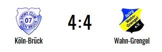 Aufsteiger SpVg. Wahn-Grengel verbuchte gestern beim 4:4 (1:1) in Brück nur einen Punktgewinn, den die Hausherren erst in allerletzter Minute der Nachspielzeit sicherstellten. Gewinner des Spiels waren die Zuschauer, die ein spektakuläres Spiel mit vielen Wendungen und Toren geboten bekamen. Brück erwischte den besseren Start und ging bereits in der 8. Minute in Führung. Nach einer scharf getretenen Ecke reagierte Engelhardt am schnellsten und drückte den Ball aus kurzer Distanz zum 1:0 über die Linie.