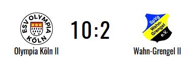 Auch die Zweitvertretung der SpVg. Wahn-Grengel läuft ihrer Vorjahresform weit hinterher. Bei Olympia Köln II gab es mit einem weiteren 10:2-Debakel die nächste Abfuhr, womit sich die Equipe  zurecht am Tabellenende befindet.