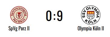 Die SpVg. Porz II kassierte im Heimspiel gegen den Titelaspiranten ESV Olympia Köln mit 0:9 (0:3) eine herbe Schlappe. Nach 25 Minuten musste die Equipe nach einer Roten Karte noch 65 Minuten in Unterzahl agieren. Der Liga-Aufsteiger rangiert damit nur noch einen Zähler über dem schwarzen Strich. Am nächsten Wochenende reist die Elf zum Türkischen FC.
