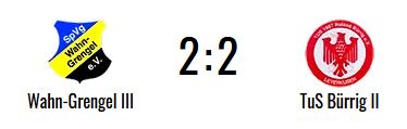 Die SpVg. Wahn-Grengel III kam gegen die Zweivertretung von Roland Bürrig nicht über ein 2:2 (1:2)-Unentschieden hinaus. Die SpVg. machte dabei einen zweimaligen Rückstand wett, ehe die Punkteteilung gesichert war. Durch das Remis kratzt die Choko/Haydar-Elf weiter an den TOP 5 der Liga. Am nächsten Wochenende reist die Mannschaft zur Zweitvertretung des VfL Poll.