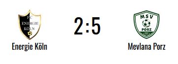 Liga-Neuling SV Mevlana Porz fuhr beim Abstiegskandidat FC Energie Köln einen 5:2 (2:1)-Auswärtserfolg ein. Für die Porzer trafen Inam (3), Kirkiz und Böyük. Die Inam-Elf festigte damit ihren 7. Tabellenplatz im Liga-Mittelfeld. Am nächsten Wochenende erwartet Mevlana den VfB Köln rrh.