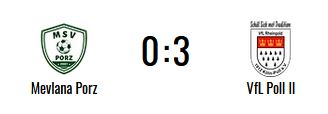 Aufsteiger SV Mevlana Porz handelte sich am gestrigen Nachmittag eine unerwartete 0:3 (0:1)-Heimniederlage gegen die Zweitvertretung des VfL Poll ein. Durch zwei Gegentreffer in der 12. und 35. Min. lag man zur Halbzeit mit 0:2 hinten.