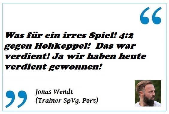 Für Porz war der Sieg ein Befreiungsschlag – und eine Bestätigung des eingeschlagenen Weges. „Wir haben das Spiel mit einer Gier gewonnen, die uns ausmacht. Das ist unser Maßstab.“ Nach dem 4:2 habe er „keine Zweifel gehabt, dass wir das noch aus der Hand geben. Hohkeppel war ideenlos, wir hatten den Plan B.“ Mit nun 10 Punkten und Tabellenplatz 10 haben die Porzer vorerst Luft im Tabellenkeller. Wendt will den Kurs beibehalten: „Wir werden nur noch Jungs in den Kader nehmen, bei denen wir das Gefühl haben, dass sie Optionen für Sonntag sind. Wer nicht mit 1.500 Prozent trainiert, hat im Kader nichts zu suchen. Ganz einfach.“