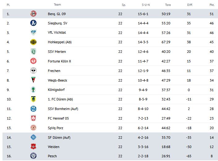 An der Tabellenspitze bleibt es für den Primus SV Bergisch Gladbach 09 (51 Pkt.) beim 5-Punkte-Vorsprung vor dem Siegburger SV (46) und dem VfL Vichttal (46). Regionalliga-Absteiger Eintracht Hohkeppel (45) muss bei noch 8 ausstehenden Spielen auf Patzer der Spitzenteams hoffen.